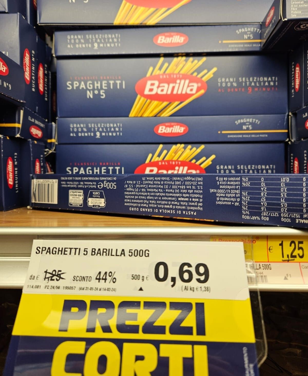 Los paquetes de fideos Barilla (penne rigate o spaghetti) se consiguen en promoción en Italia por 69 centavos de euros ($615), aunque su precio normal es de 1,25 euros. En la Argentina se venden en alrededor de $6.000. Un paquete de fideos nacionales, por ejemplo Cica, valen 1.100, más caros que los Barilla en Italia.