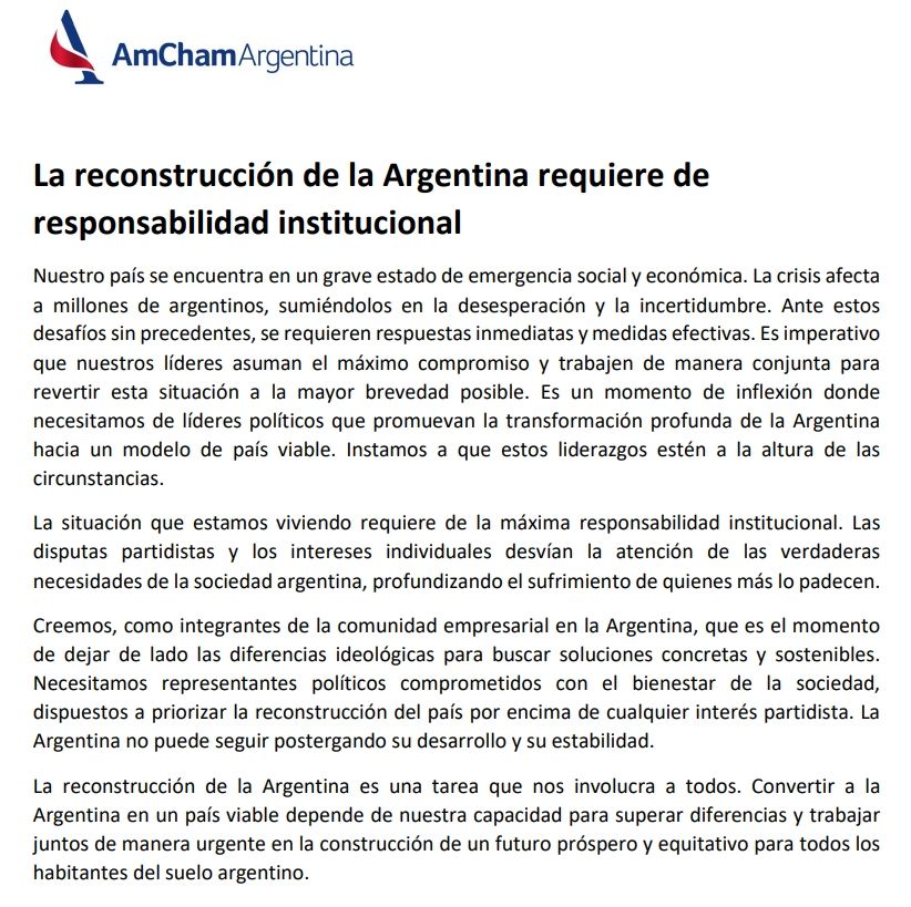 “La reconstrucción de la Argentina es una tarea que nos involucra a todos. Convertir a la Argentina en un país viable depende de nuestra capacidad para superar diferencias y trabajar juntos de manera urgente en la construcción de un futuro próspero y equitativo para todos los habitantes del suelo argentino”, cierra el texto difundido esta tarde desde la cámara empresaria.