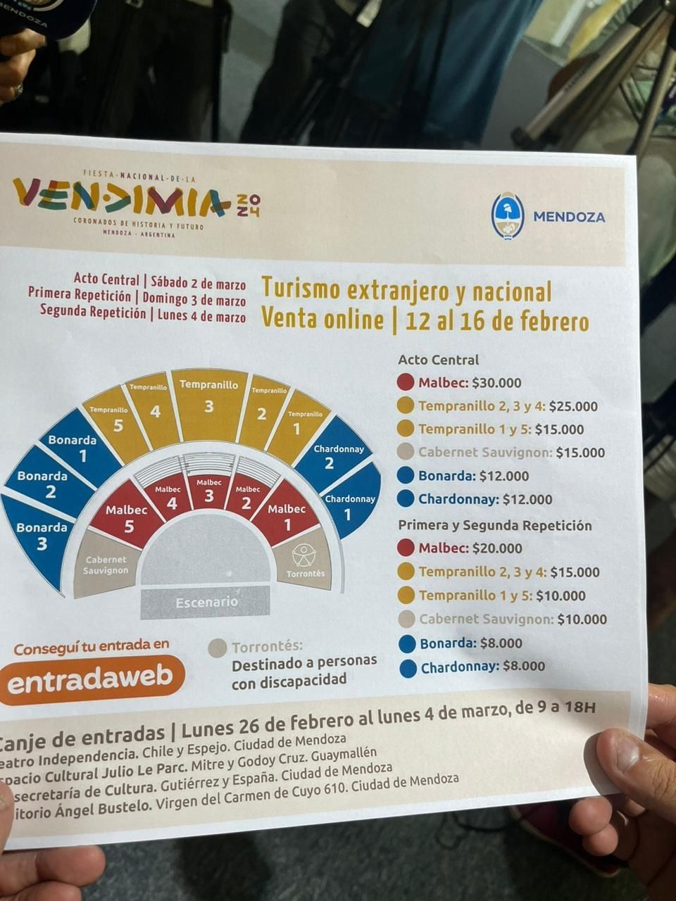 Los valores de los tickets para el Acto Central serán: Malbec $15.000; Tempranillo 2, 3 y 4 $12.500; Tempranillo 1 y 5 $7.500; Cabernet $7.500, y Bonarda y Chardonay $5.500. Al igual que en otras oportunidades, el sector Torrontés no se comercializa porque está destinado a personas con discapacidad, tanto para el Acto Central como para las repeticiones.