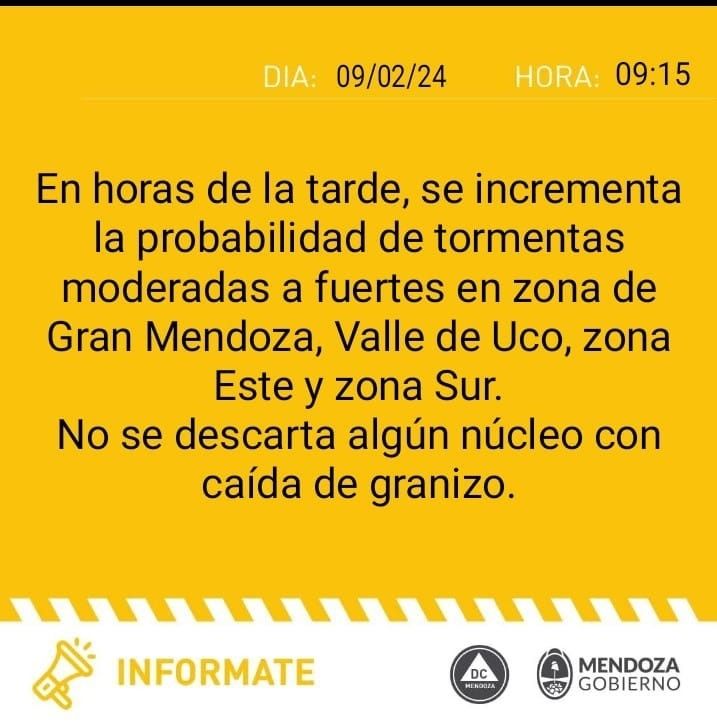 "En horas de la tarde se incrementa la probabilidad de tormentas moderadas a fuertes en zona de Gran Mendoza, Valle de Uco, zona Este y zona Sur. No se descarta algún núcleo con caída de granizo", informaron desde Defensa Civil.