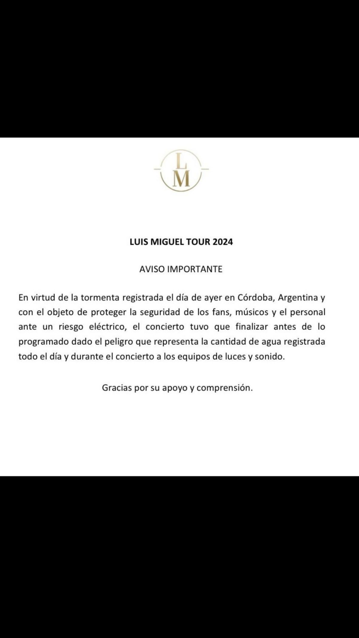 En las últimas horas, trascendió un comunicado por parte de la organización en el que señalaron lo siguiente: "LUIS MIGUEL TOUR 2024. AVISO IMPORTANTE. En virtud de la tormenta registrada el día de ayer en Córdoba, Argentina y con el objeto de proteger la seguridad de los fans, músicos y el personal ante un riesgo eléctrico, el concierto tuvo que finalizar antes de lo programado dado el peligro que representa la cantidad de agua registrada todo el día y durante el concierto a los equipos de luces y sonido. Gracias por su apoyo y comprensión".