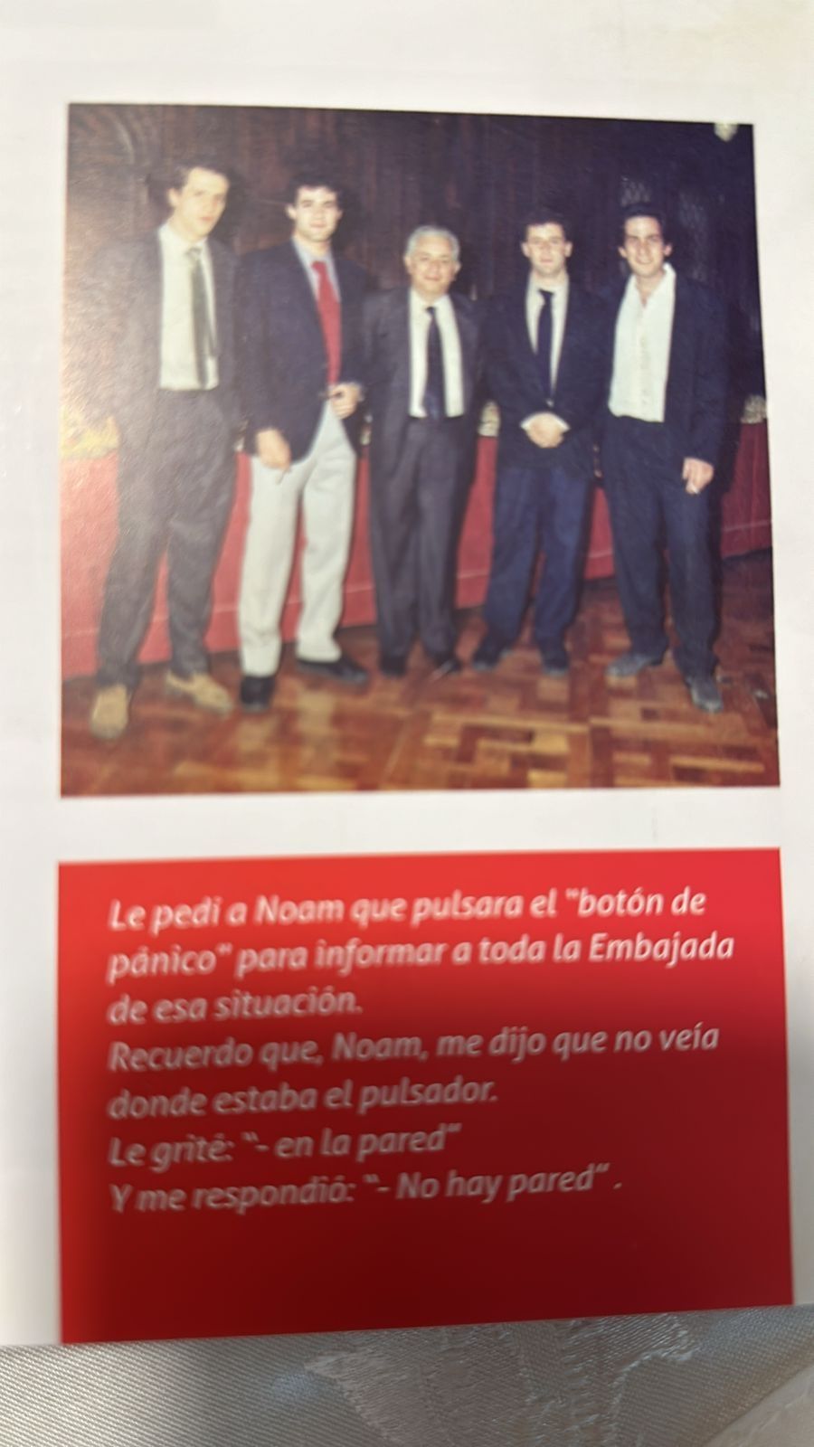 Por aquellos días, el orden y la tranquilidad de la embajada israelí se habían visto alterados por una serie de refacciones que se estaban desarrollando en el edificio. “Nos habían mudado a salas diferentes y el ingreso que se hacía habitualmente por la puerta que estaba en el medio, que era la puerta de seguridad, estaba anulada”, recuerda. Faltaban 13 minutos para las 15 cuando Martín, que en ese momento estaba en su oficina junto a tres “hermanos de la vida”, escuchó un ruido estremecedor.