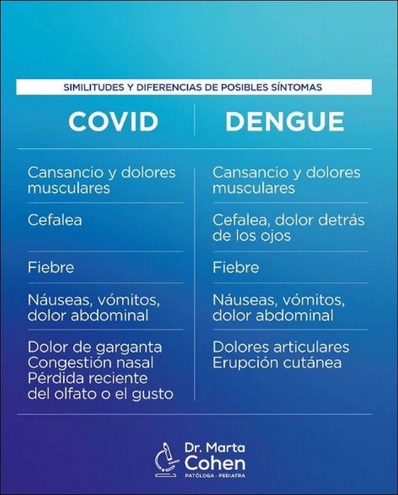 Cohen además expresó que el virus del covid y del dengue están circulando de forma simultánea en Argentina. En ese sentido, dijo que inclusive es posible que ambas enfermedades se den al mismo tiempo en un paciente. Y, aunque algunos síntomas son similares, hay otros que son característicos de cada una de ellas.