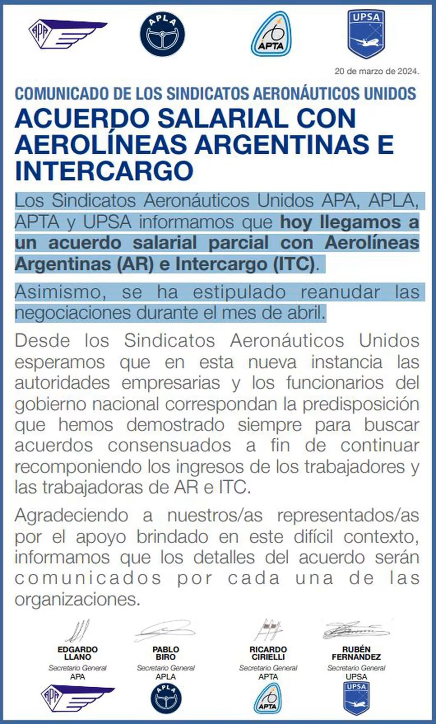 En el comunicado que informó que se levantaba el paro, los sindicalistas informaron: "Llegamos a un acuerdo salarial parcial con Aerolíneas Argentinas (AR) e Intercargo (ITC) y se ha estipulado reanudar las negociaciones durante el mes de abril”. El comunicado contó con la firma de Edgardo Llano (Asociación de Personal Aeronáutico), Pablo Biro (Asociación Pilotos de Líneas Aéreas), Ricardo Cirielli (Asociación del Personal Técnico Aeronáutico) y Rubén Fernández (Unión del Personal Superior y Profesional de Empresas Aerocomerciales).
