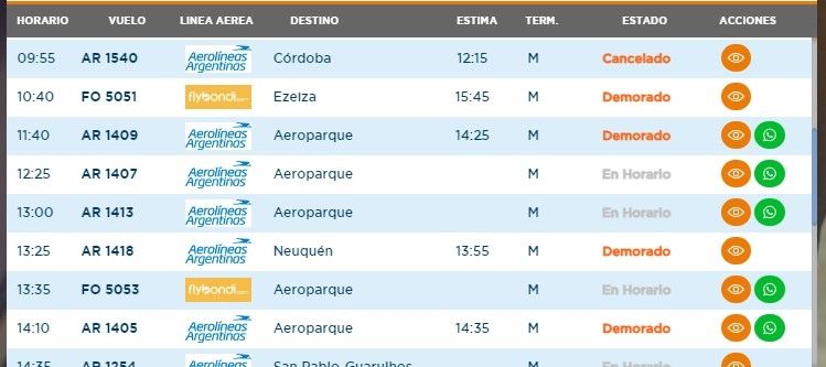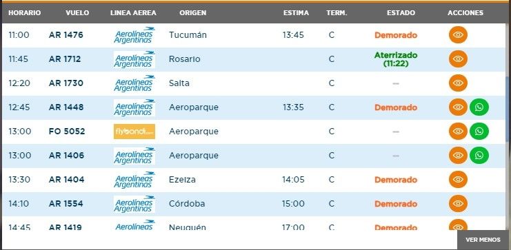 El vuelo que debía llegar desde Aeroparque a las 9.45 debió ser cancelado, al igual que otros más de 40 viajes que debían partir de esa terminal. En tanto, se estima que las complicaciones se irán replicando a lo largo del resto de la jornada debido a lo que se denomina "efecto dominó", ya que los vuelos que no pudieron arribar a la estación aérea, tampoco podrán partir para cumplir con los servicios posteriores.
