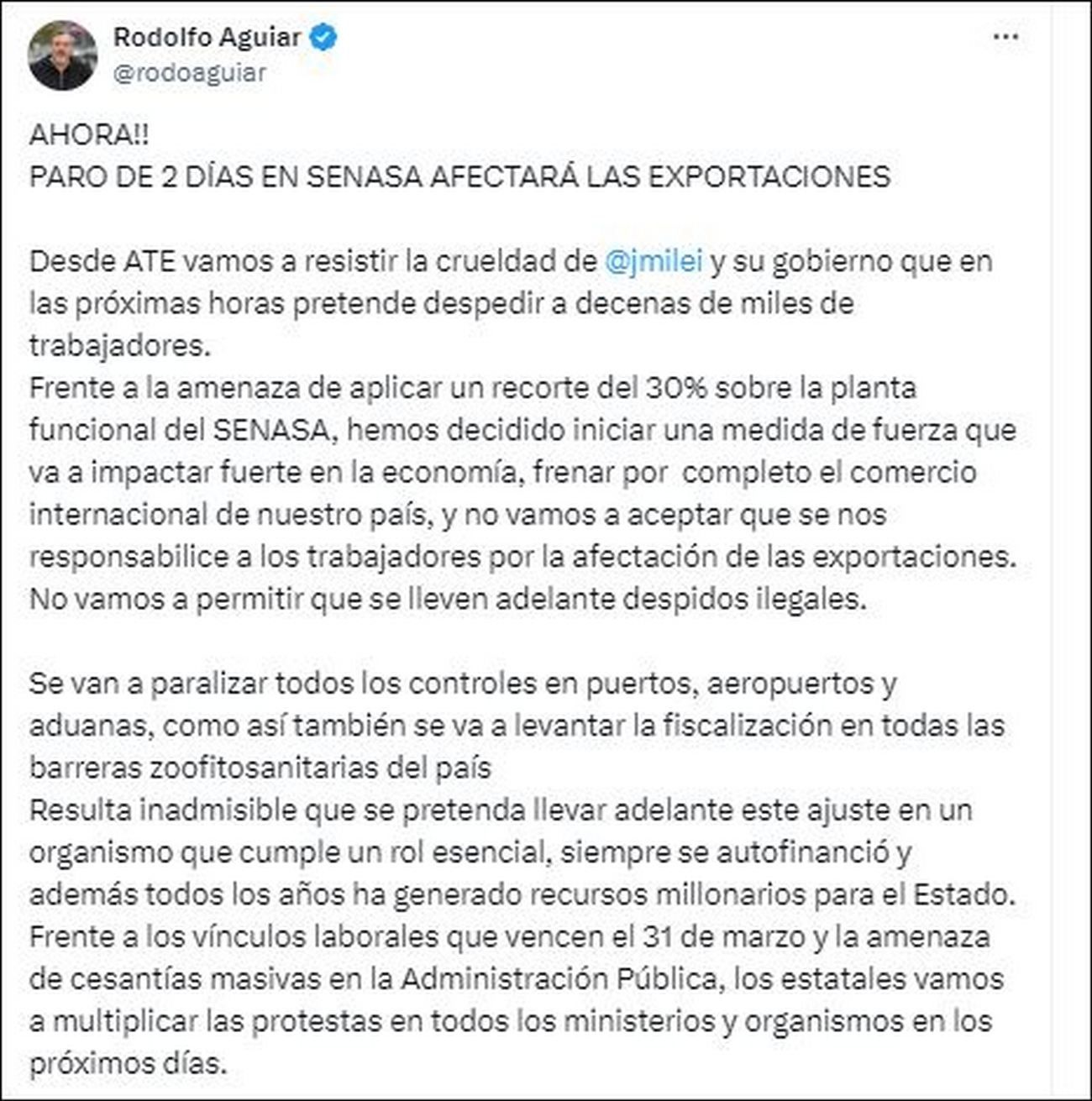 "Frente a la amenaza de aplicar un recorte del 30% sobre la planta funcional del Senasa, hemos decidido iniciar una medida de fuerza que va a impactar fuerte en la economía, frenar por completo el comercio internacional de nuestro país, y no vamos a aceptar que se nos responsabilice a los trabajadores por la afectación de las exportaciones", advirtió Aguiar. Y continuó: "No vamos a permitir que se lleven adelante despidos ilegales. Se van a paralizar todos los controles en puertos, aeropuertos y aduanas, como así también se va a levantar la fiscalización en todas las barreras zoofitosanitarias del país".