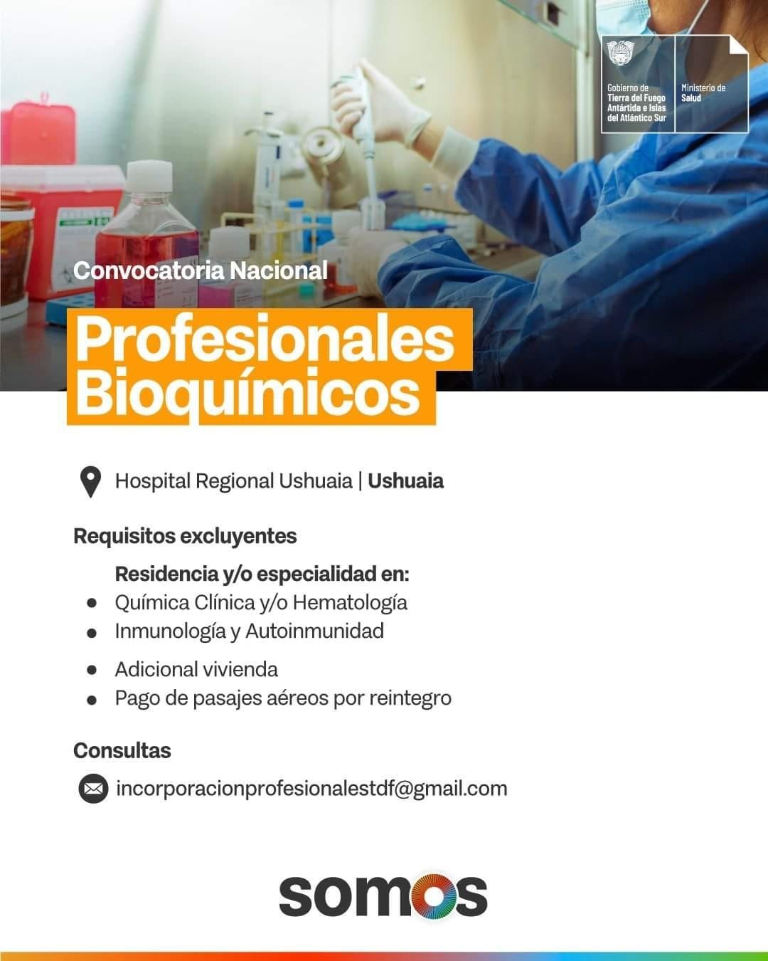 El Hospital Regional Ushuaia, provincia de Tierra del Fuego, lanzó una intensa búsqueda a todo el país para incorporar a su staff bioquímicos que de forma excluyente tengan dos especialidades: en química clínica y/o hematología y en inmunología y autoinmunidad ya que necesita cubrir con urgencia vacantes en esas áreas.