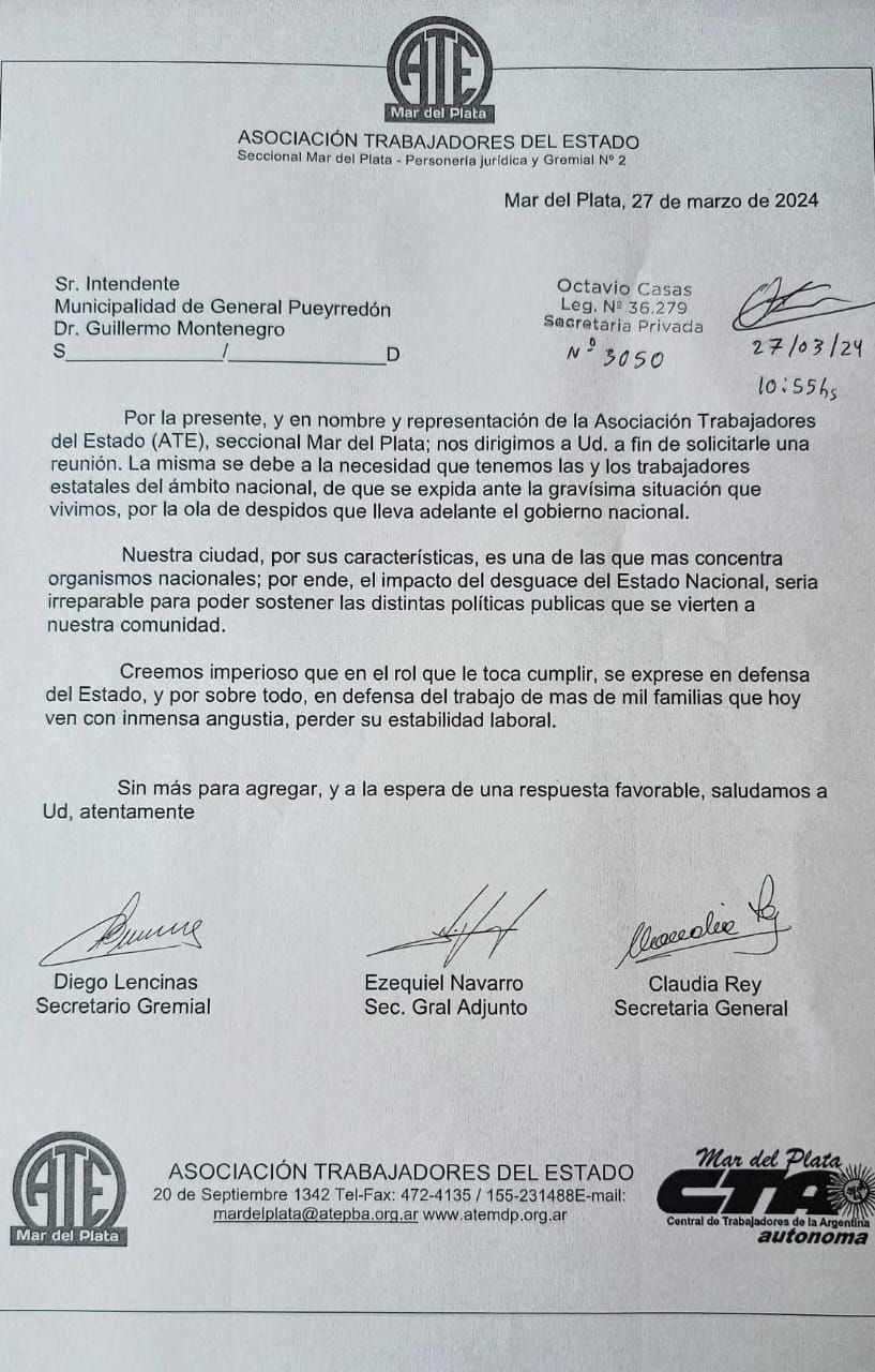 En el documento que firmaron Diego Lencinas, secretario gremial, Ezequiel Navarro, secretario general adjunto, y Claudia Rey, secretaria general, buscan conversar con el jefe comunal sobre "la gravísima situación" que atraviesan ante la ola de despidos del Gobierno nacional.