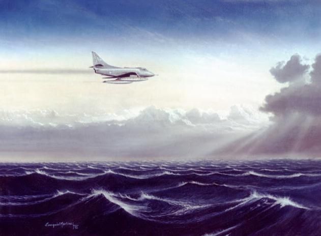 El Capitán de Reserva VGM (R) y pintor de temas aeronáuticos, Exequiel Martínez, recreó en un cuadro a los A-4B, volando rasante, instantes después de atacar los módulos del general Moore. En primer plano, con su gris inconfundible, pintó al “Tordillo”.