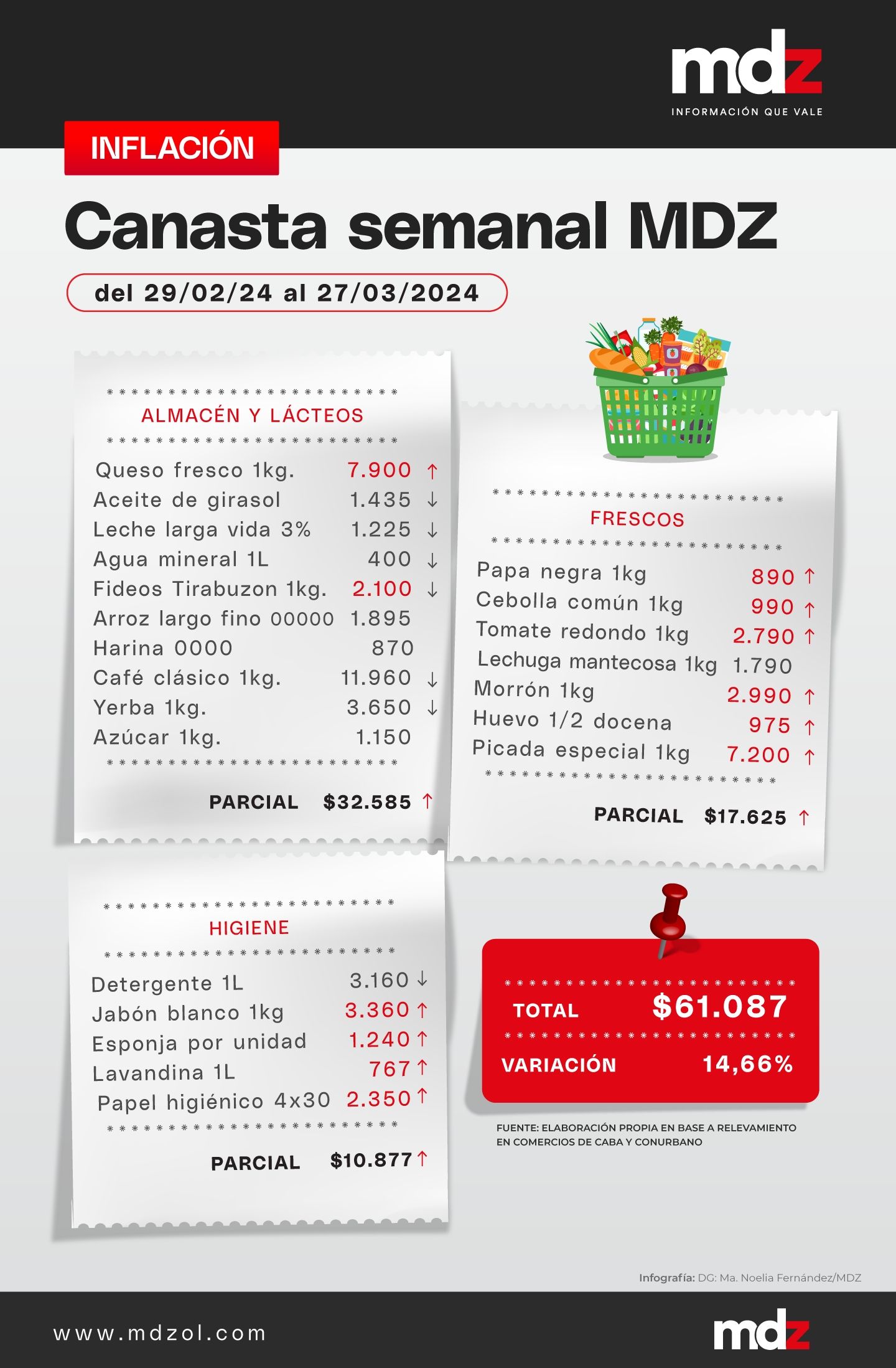 Aunque el Gobierno insiste con el gran logro de la desaceleración de la inflación, los precios siguen creciendo y están cada vez más altos, por ende inalcanzables. Este mismo ejercicio, realizado a fines de diciembre, arrojó que esta compra costaba $45.158, pasando a costar unos $61.087, lo que significa un incremento del 35,27% en solo tres meses.