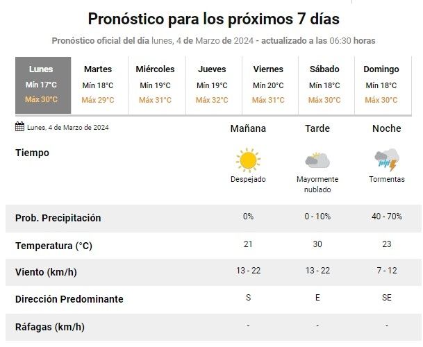 El pronóstico detalla que la jornada de este lunes estará parcialmente nublada con descenso de la temperatura y tormentas aisladas. Además, se registrarán vientos moderados del sector sur.
