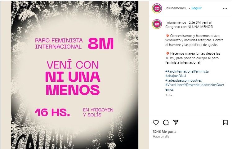 La convocatoria para manifestarse es en Yrigoyen y Solís, en el extremo sur de la Plaza del Congreso, para las 16. Se espera, según aseguran desde Ni Una Menos, que sea una de las más grandes del movimiento feminista de Argentina. Al mismo tiempo, en la publicación de Instagram remarcaron: "Concentramos y hacemos ollazo, verdurazo y movidas artísticas. Contra el hambre y las políticas de ajuste".