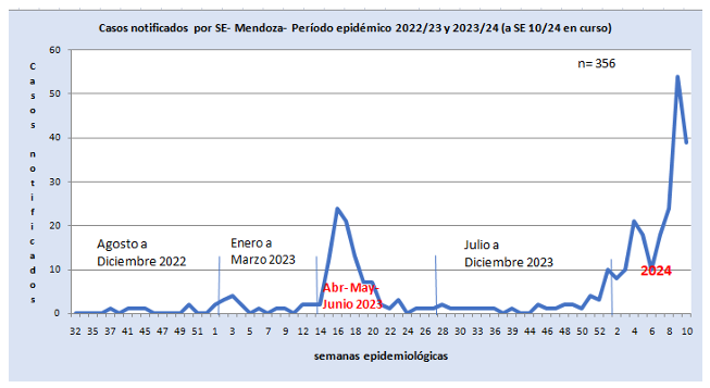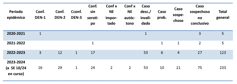 En retrospectiva, en los anteriores tres períodos epidémicos (2020-2021, 2021-2022 y 2022-2023) se notificaron en la provincia un total 133 casos sospechosos de dengue. En lo que va del periodo endémico 2023-2024 ya hay contabilizados 233 casos sospechosos. Se produjo un significativo aumento del número de casos reportados en relación con los registros históricos.