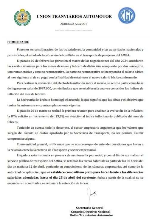 El comunicado completo de la UTA
