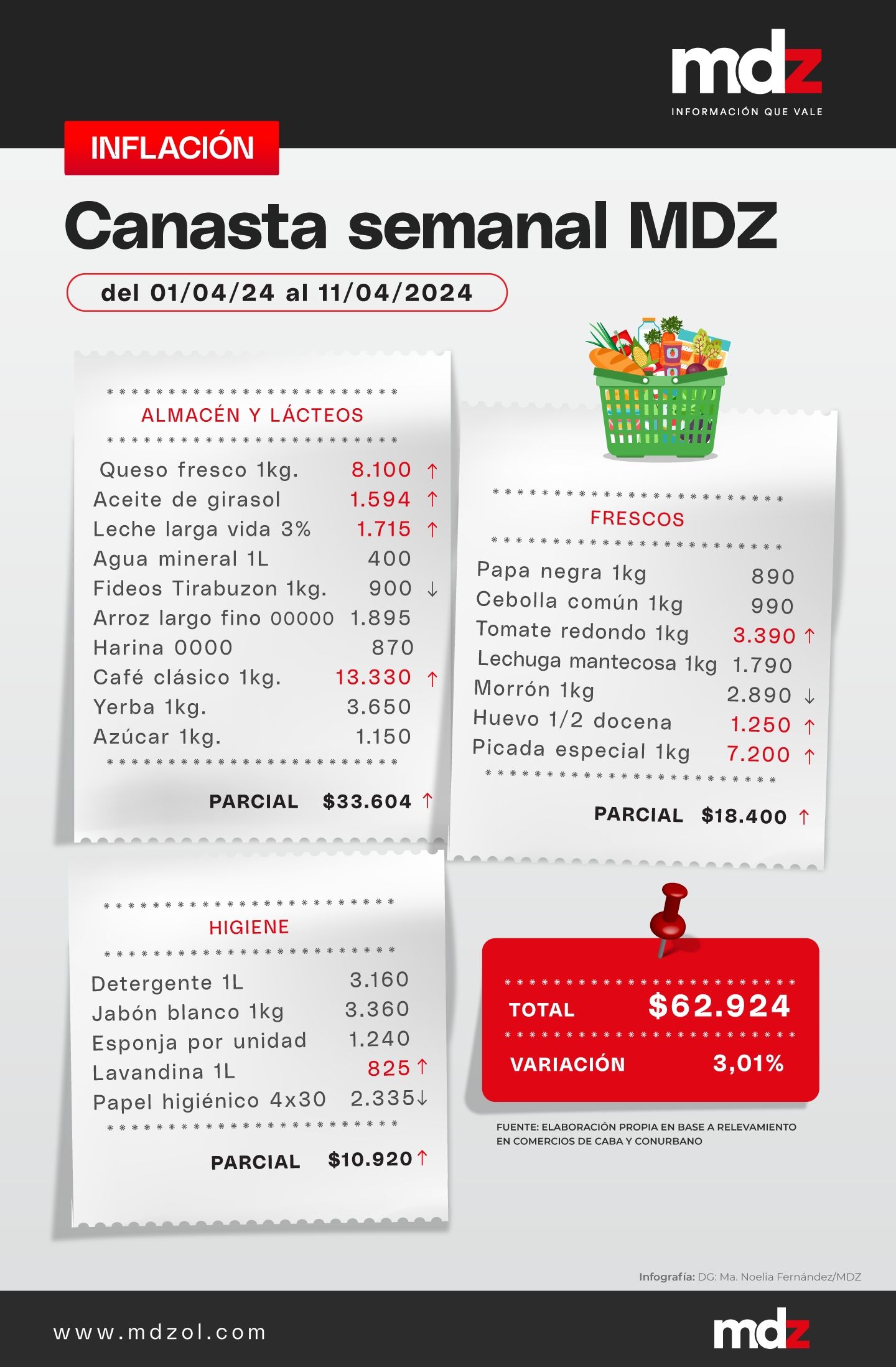 Respecto a los productos de la canasta básica relevados por MDZ, los alimentos frescos sufrieron aumentos del 4,40%, pasando de costar $17.625 a $18.400. Los huevos sufrieron un aumento del 28,21%, mientras que el tomate también tuvo un aumento por encima del 20%, llegando al 21,51%. El morrón, en cambio, pasó de costar $2.990 por kilogramo a $2.890, lo que representa una baja de 3,34%.