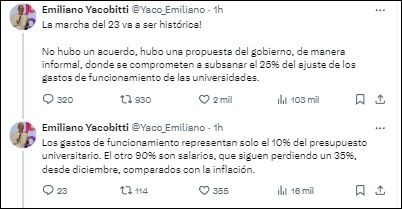 "No hubo un acuerdo, hubo una propuesta del Gobierno, de manera informal, donde se comprometen a subsanar el 25% del ajuste de los gastos de funcionamiento de las universidades", aclaró desde su cuenta de X, donde además compartió un comunicado del Consejo Interuniversitario Nacional (CIN) en el que ratifican la marcha del 23 de abril.