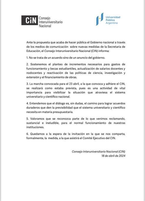 Agregando que "la marcha convocada para el 23 de abril, a la que convoca y adhiere el CIN, se realizará como estaba prevista, pues es una actividad de vital importancia para visibilizar la situación que atraviesa el sistema universitario y científico nacional”.