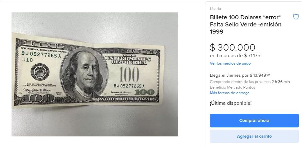 Este producto se ofrece en Mercado Libre, un lugar donde es muy común encontrar publicaciones de billetes de este estilo, ideales para los fanáticos de la numismática.