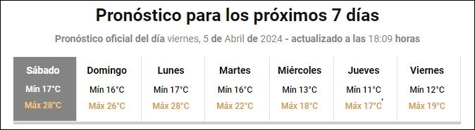 En tanto que el Servicio Meteorológico Nacional (SMN) señala un sábado agradable, con temperaturas que oscilarán entre los 17ºC y los 28ºC. Sin probabilidades de lluvia ni ningún otro tipo de alerta.