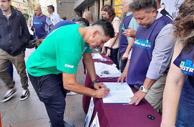 En el centro de la ciudad, Peatonal San Martín esquina Córdoba, los bancarios continúan recolectando firmas para que no privaticen el Banco Nación y pusieron leyendas que indican que siguen en "estado de asamblea permanente", por el proyecto de ley ómnibus que deberán tratar los diputados nacionales.