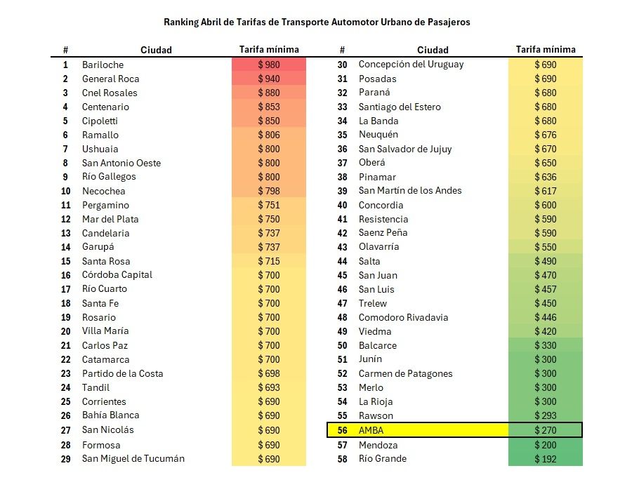 En cuanto al valor del boleto de colectivo en el Interior, por mencionar algunas de las principales ciudades del país, en Bariloche se pagan $980, en Ushuaia $800, en Córdoba, Santa Fe y Rosario $700, en San Miguel de Tucumán $690, en Neuquén $676, y en Salta $490. Mientras tanto, en el AMBA, la tarifa mínima está ubicada en $270,una de las más baratas del país, por encima de Mendoza ($200) y Río Grande ($192)