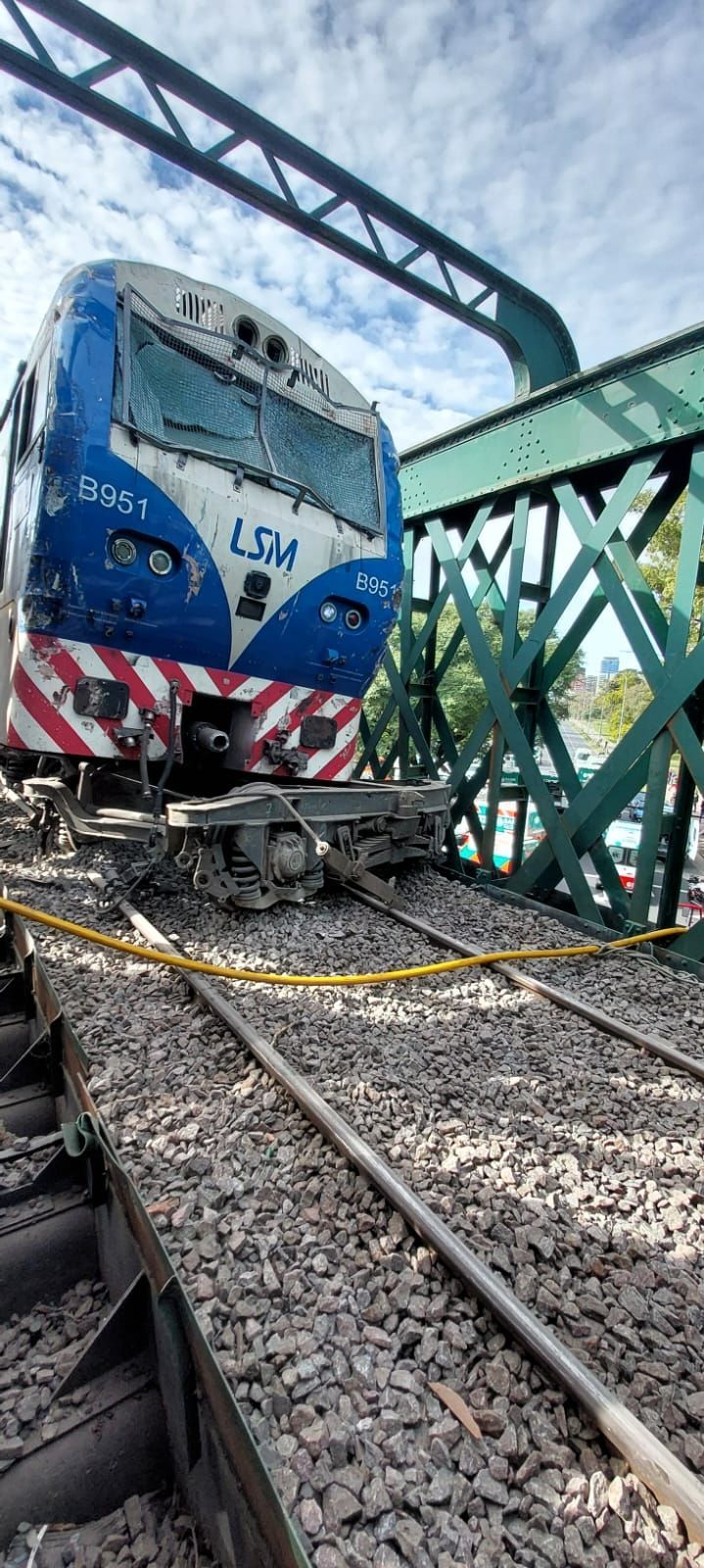 Trenes Argentinos comunica que una formación -con siete coches- de la línea San Martín colisionó con una locomotora y un coche furgón vacío, a las 10.31, en el kilómetro 4,900 - a la altura de la avenida Alcorta- sobre el viaducto Palermo.