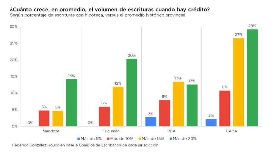 A medida que aumenta la incidencia del crédito, aumenta la cantidad de operaciones en el mercado. En Mendoza, por ejemplo, cuando en un año determinado más del 20% de las operaciones son con una hipoteca, el volumen de operaciones es 14% mayor al promedio. Mientras que en la provincia de Buenos Aires, el efecto es similar: cuando más del 5% de las operaciones son con hipoteca, el volumen promedio aumenta 3% pero, cuando el 15% o más de las operaciones son con hipoteca, el volumen promedio aumenta 13%.
