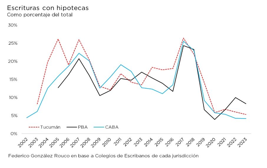 El trabajo de Tejido Urbano señala que en Tucumán la relevancia es más clara, porque es más progresiva, al igual que en CABA. Los años con más del 20% de las operaciones hechas con hipoteca tienen, en promedio, 20% y 29% más operaciones que el promedio, para Tucumán y CABA, respectivamente.