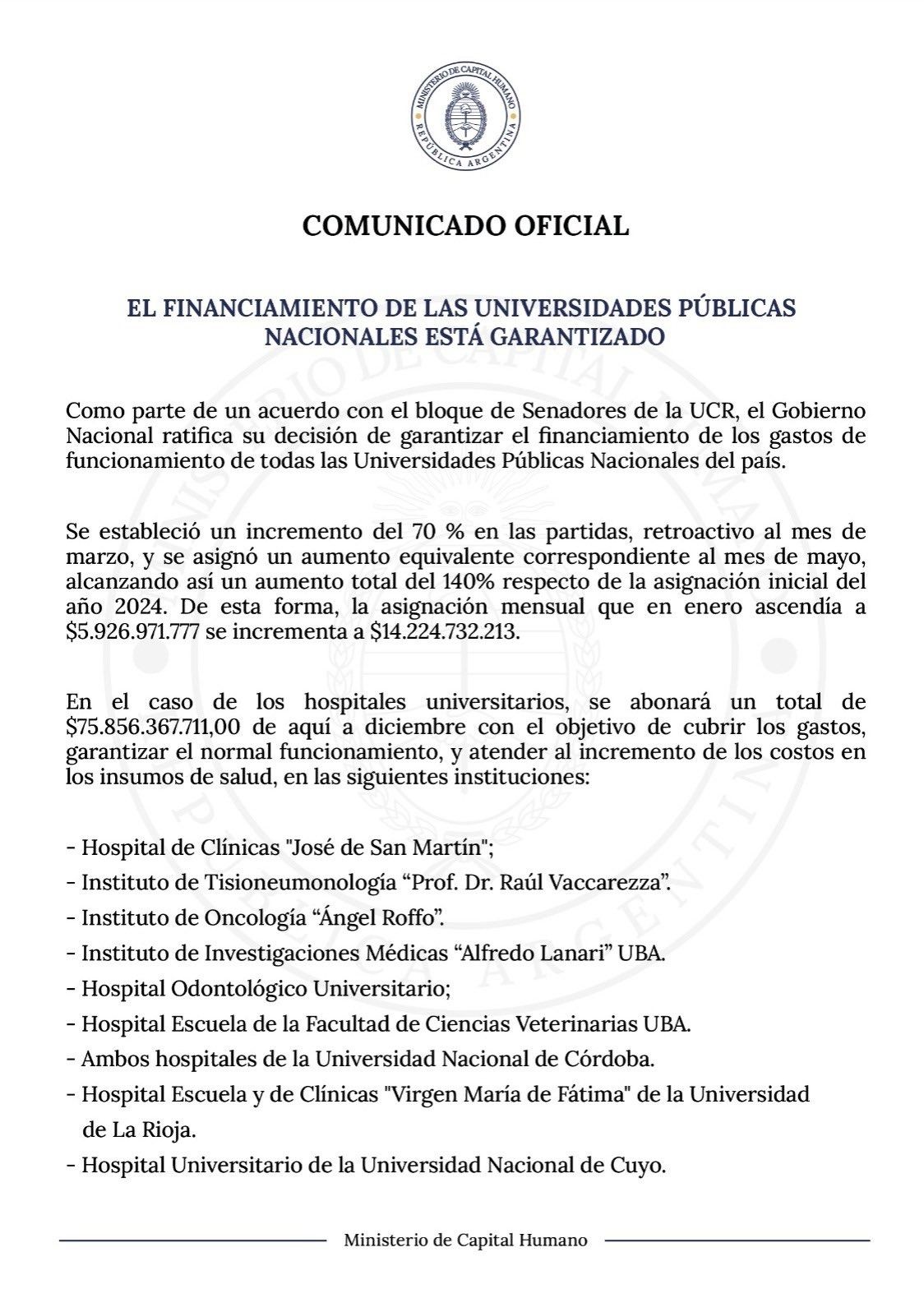 En la misiva remarcaron que "se estableció un incremento del 70% en las partidas, retroactivo al mes de marzo, y se asignó un aumento equivalente correspondiente al mes de mayo, alcanzando así un aumento total del 140% respecto de la asignación inicial del año 2024", Este aumento del presupuesto, sellado días antes de la marcha en defensa de las universidades nacionales, llevó la asignación mensual de $5.926.971.777 a $14.224.732.213.