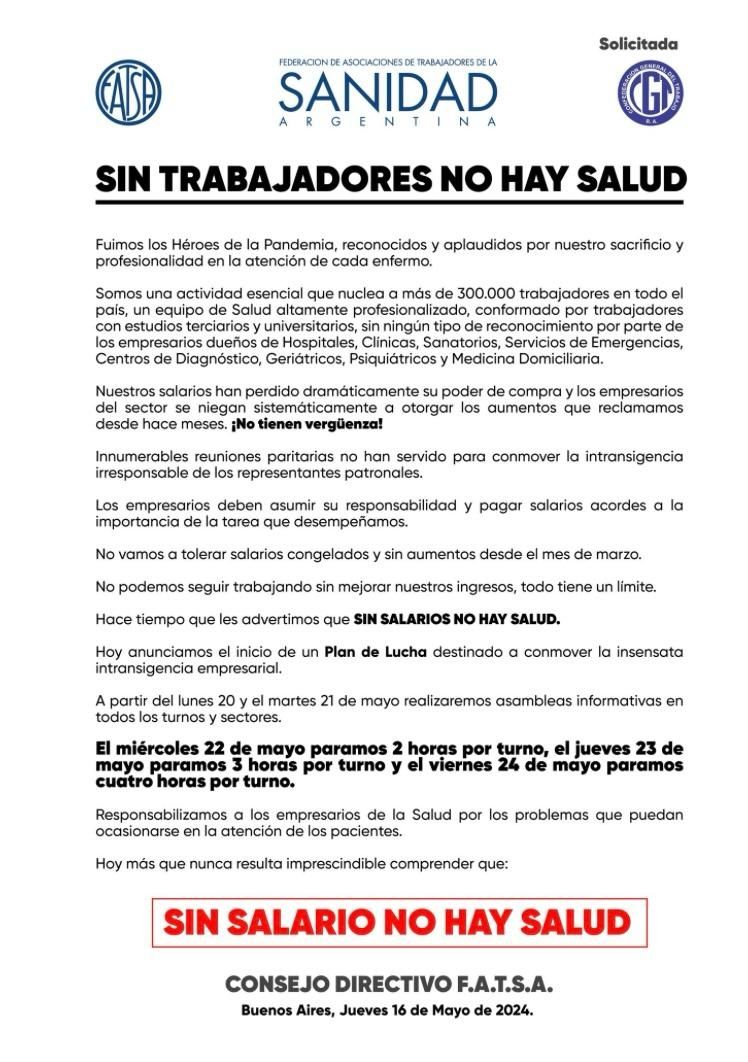 Por otra parte, en medio de la difícil situación que atraviesan los nosocomios privados en la provincia de Buenos Aires por el atraso en los pagos y en la actualización de los valores de las prestaciones y practicas profesionales, la Federación de Asociaciones de la Sanidad Argentina (FATSA) desde este miércoles arranco con un paro en reclamo de un incremento salarial.