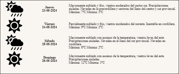 El Servicio Meteorológico Nacional (SMN), a través de su Sistema de Alerta Temprana, anticipa para este jueves nevadas en varias zonas de Mendoza.