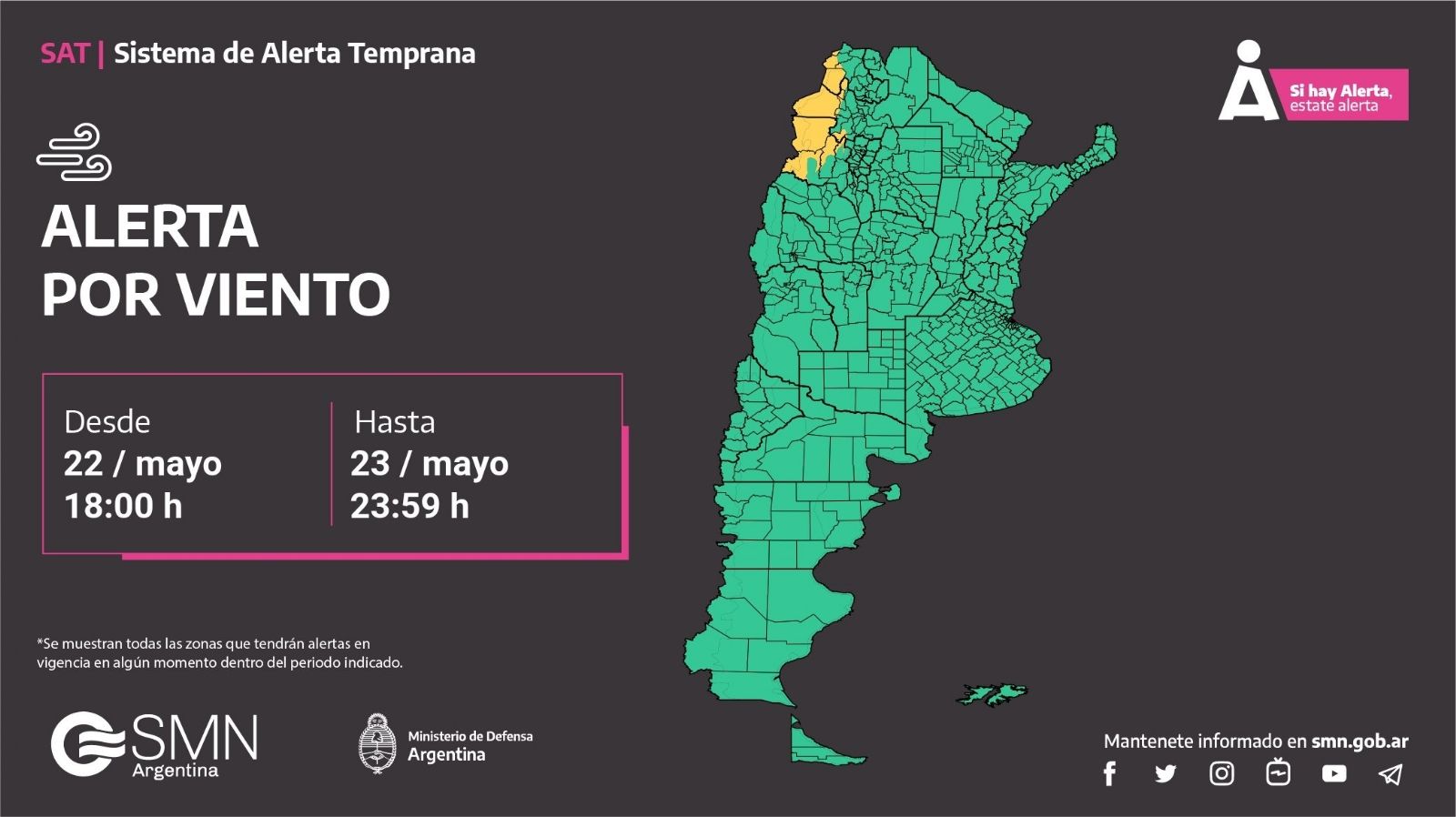 El Servicio Meteorológico Nacional (SMN), a través de su Sistema de Alerta Temprana, emitió una serie de advertencias para este jueves 23 de mayo, por distintos fenómenos que tendrán lugar en varias zonas del país.