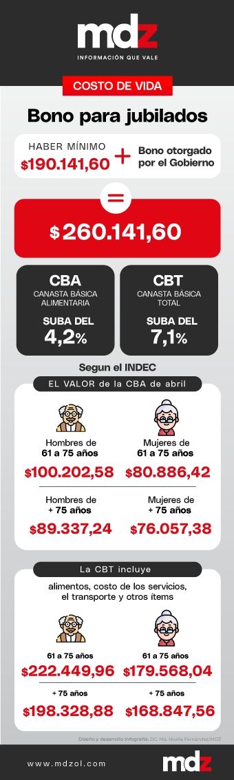 Según el cálculo del Indec, el valor de la CBA de abril para adultos hombres de 61 a 75 años es de $100.202,58, mientras que para mujeres de la misma edad es de $80.886,42. La CBT, en cambio, no se ciñe solo a los alimentos, sino que también incluye el costo de los servicios, el transporte y otros ítems, lo que genera un fuerte aumento, llegando a ser de $222.449,96 para los hombres y de $179.568,04 para las mujeres.