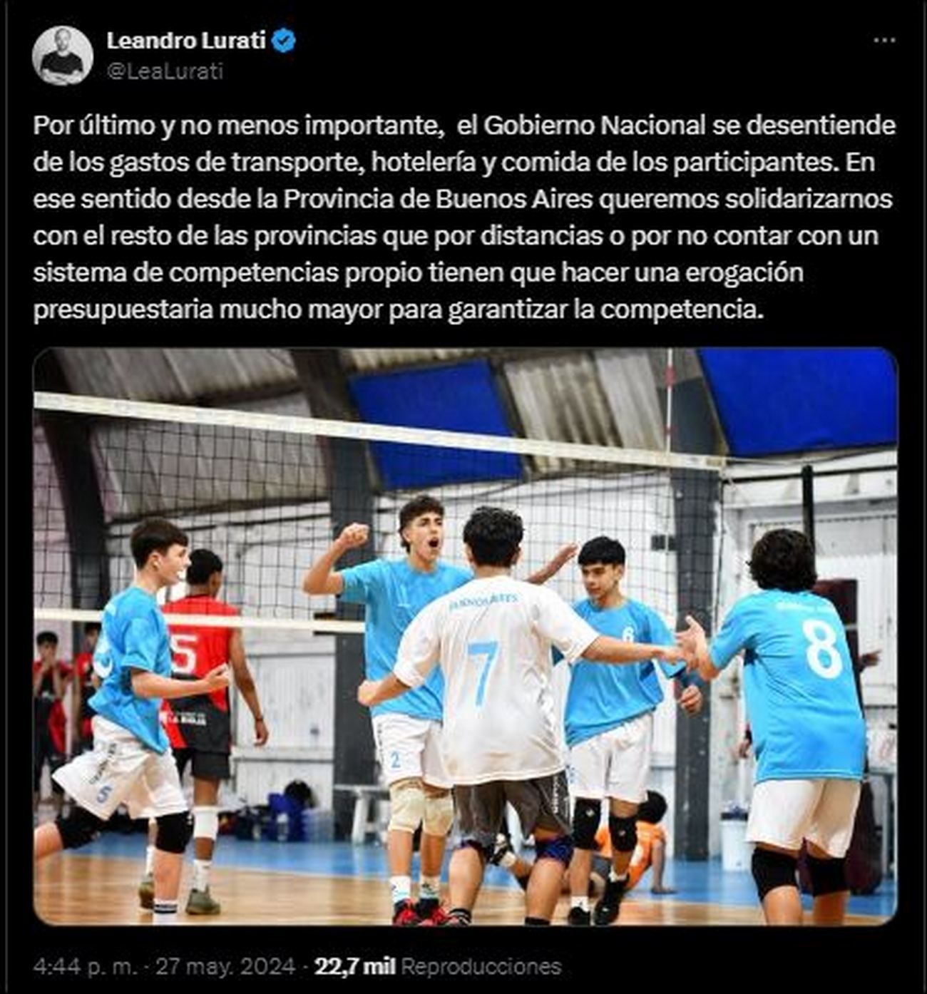 "Por último y no menos importante, el Gobierno Nacional se desentiende de los gastos de transporte, hotelería y comida de los participantes. En ese sentido, desde la Provincia de Buenos Aires queremos solidarizarnos con el resto de las provincias que por distancias o por no contar con un sistema de competencias propio, tienen que hacer una erogación presupuestaria mucho mayor para garantizar la competencia", indicó Lurati al finaliza su hilo por X.