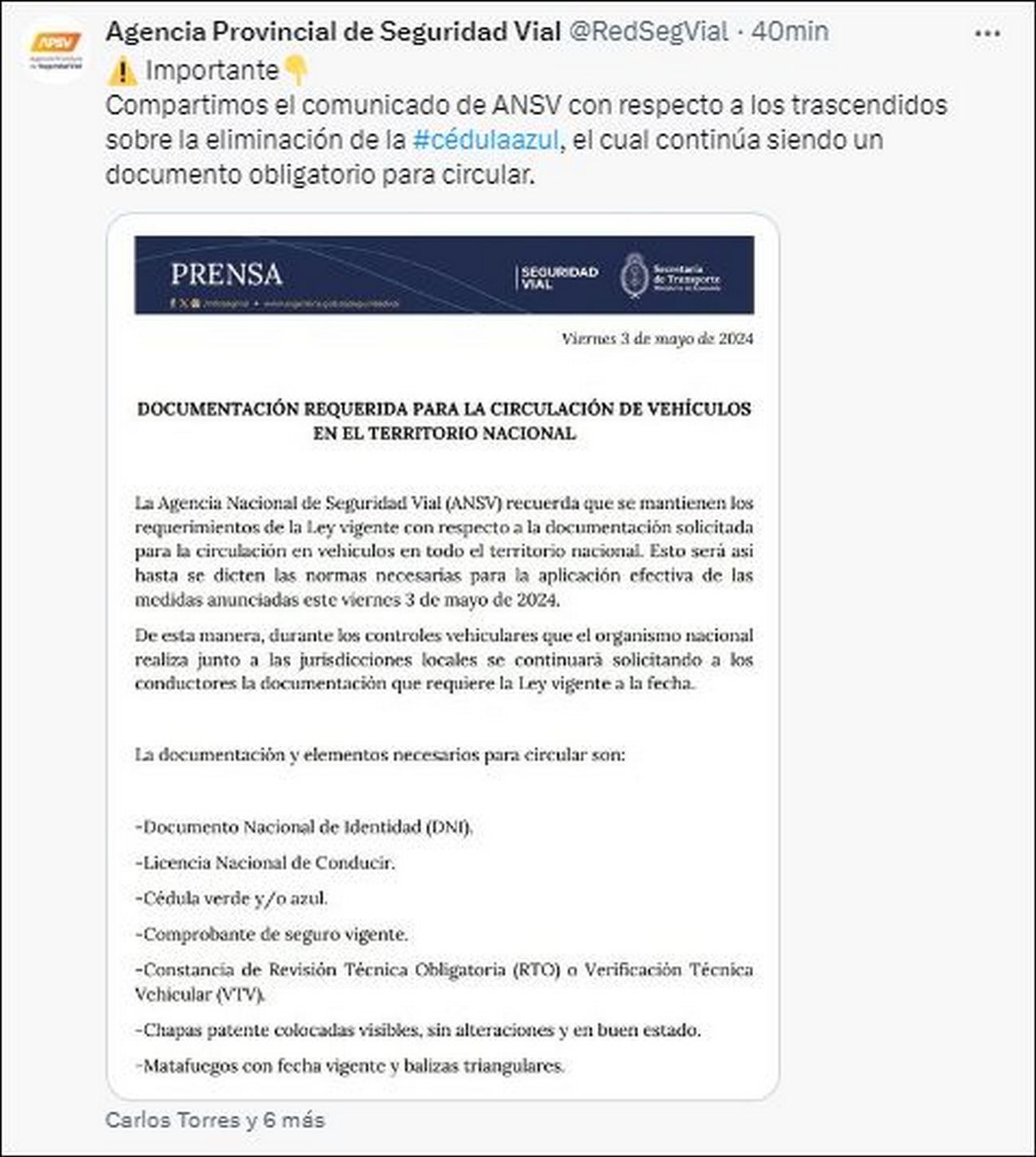 "Se recuerda que se mantienen los requerimientos de la Ley vigente con respecto a la documentación solicitada para la circulación en vehículos en todo el territorio nacional. Esto será así hasta se dicten las normas necesarias para la aplicación efectiva de las medidas anunciadas este viernes 3 de mayo de 2024", aclaró el organismo nacional.