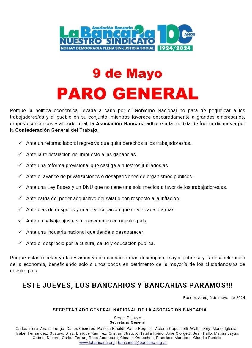El sindicato que nuclea a los trabajadores bancarios, la Bancaria, confirmó este martes que se adhiere al paro general encabezado por la CGT, del próximo jueves 9 de mayo. Por lo tanto, no habrá anteción al público durante ese día en las sucursales de todos los bancos del país.