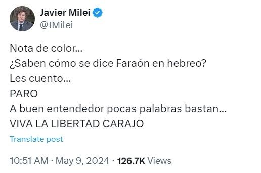 Poco antes del mediodía, el presidente lanzó un tuit contra la medida de fuerza gremial bajo un particular mensaje: "Nota de color... ¿Saben cómo se dice Faraón en hebreo? Les cuento: paro. A buen entendedor pocas palabras bastan. Viva la libertad, carajo".