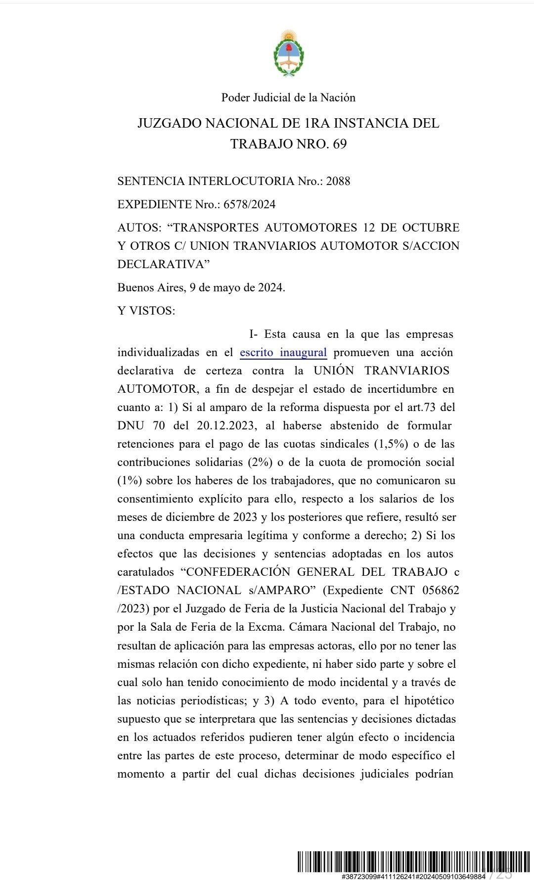 A través de X (ex Twitter), la CGT compartió una captura del documento emitido por el Juzgado Nacional del Trabajo N 69.