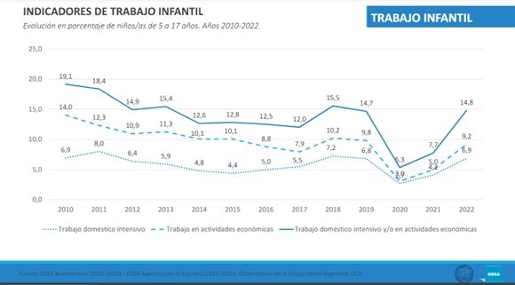Este mismo estudio, que analiza el periodo 2010-2022, señala que el pico máximo del trabajo infantil fue en 2010, con el 19,1%. El piso de la serie se encuentra en 2020 (5,3%), el cual debe ser entendido en el contexto de cuarentena por la pandemia del COVID-19. Esta causa se observa con mayor claridad si se toma que, entre 2021 (aún con restricciones sanitarias) y 2022 (contexto normalizado) el trabajo infantil se incrementó 7,1 puntos porcentuales. El pequeño fragmento histórico muestra que el siglo XXI cuenta con cifras de trabajo infantil que no se pudieron o quisieron eliminar. El trabajo infantil en Argentina es una realidad persistente en el tiempo que debe revertirse.