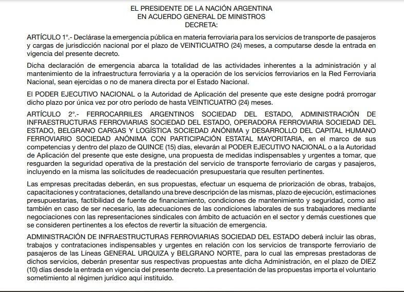 El Gobierno decretó este jueves la Emergencia Pública en Materia Ferroviaria por 24 meses. Esta medida fue publicada en el Boletín Oficial y busca que las empresas públicas de ese sector presenten un plan de readecuación y priorización de obras.