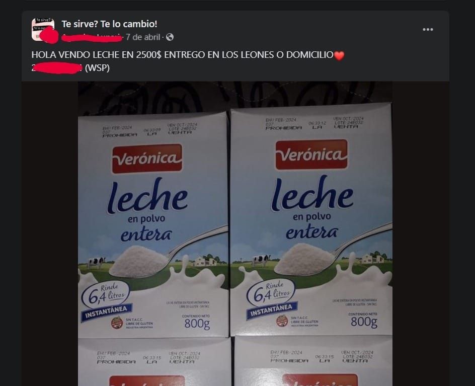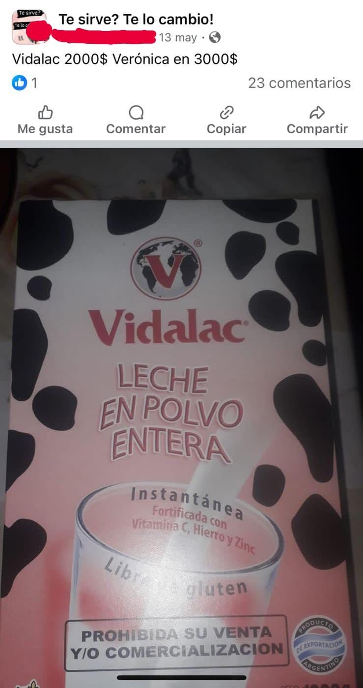 Pero la venta de este alimento no es nada nuevo en las redes. Una de las mujeres señaladas en la denuncia que cayó en la Fiscalía 6 de Las Heras, lleva bastante tiempo realizando publicaciones en el espacio de compra venta de Facebook. De hecho, el pasado 13 de mayo, un mes antes de que llegara la partida de Capital Humano a la provincia, hizo un posteo donde anunciaba que la caja de leche Vidalac de 800 gramos costaba 2.000$, cuando en el mercado formal supera los $5.000. No obstante eso, en el mismo anuncio ofrecía el mismo producto, pero marca Verónica, a 3.000 (leche que el jueves ya la vendía a 3.500). El mismo, también con la inscripción de "Prohibida su venta y/o comercialización".