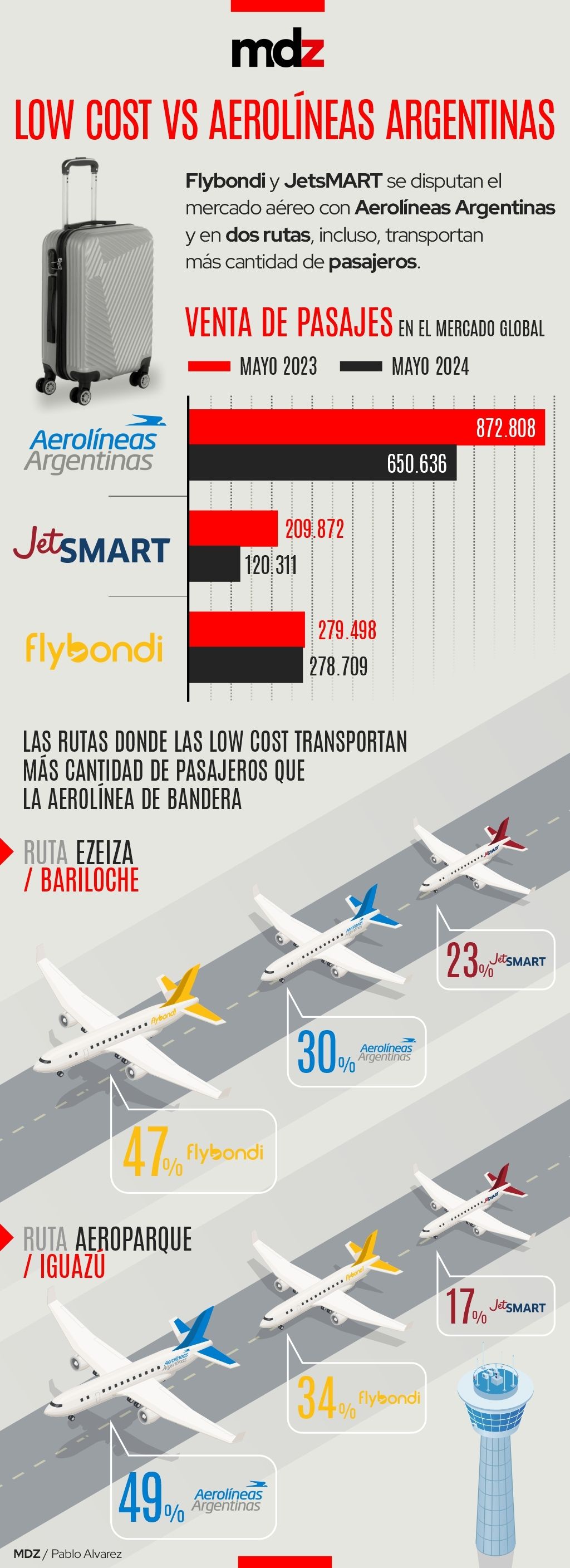 En la ruta Aeroparque-Bariloche Aerolíneas tiene una participación del 50%. El resto del mercado se lo reparte Flybondi con 32% y JetSMART con 18%. Si se toman las salidas a Bariloche desde Ezeiza, Aerolíneas Argentinas pierde el liderazgo y sólo representa 30% de los pasajeros transportados, JetSMART el 23% y Flybondi el 47%.