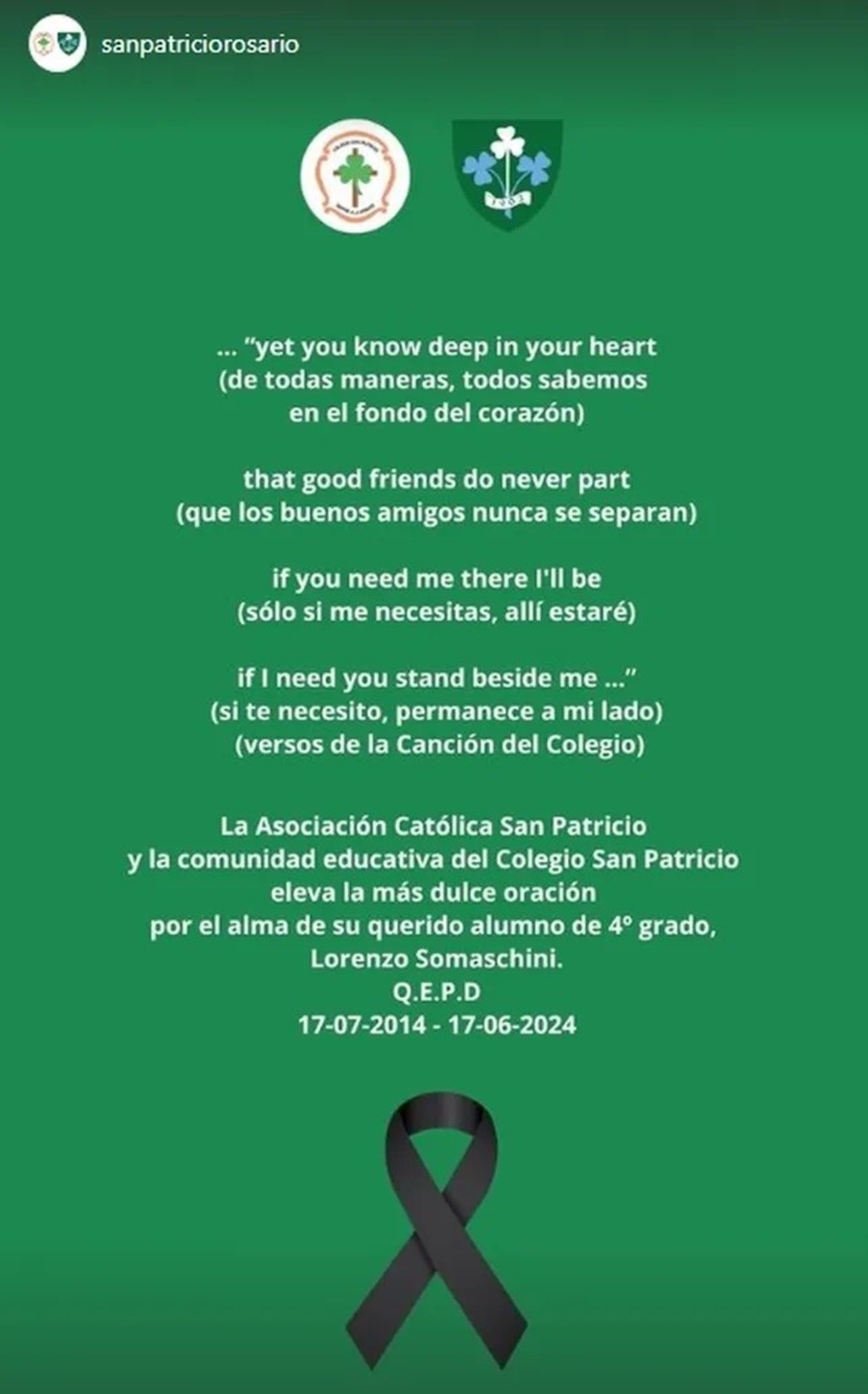 "La Asociación Católica San Patricio y la comunidad educativa del Colegio San Patricio eleva la más dulce oración por el alma de su querido alumno de cuarto grado, Lorenzo Somaschini", concluye el comunicado del instituto de raíces irlandesas.