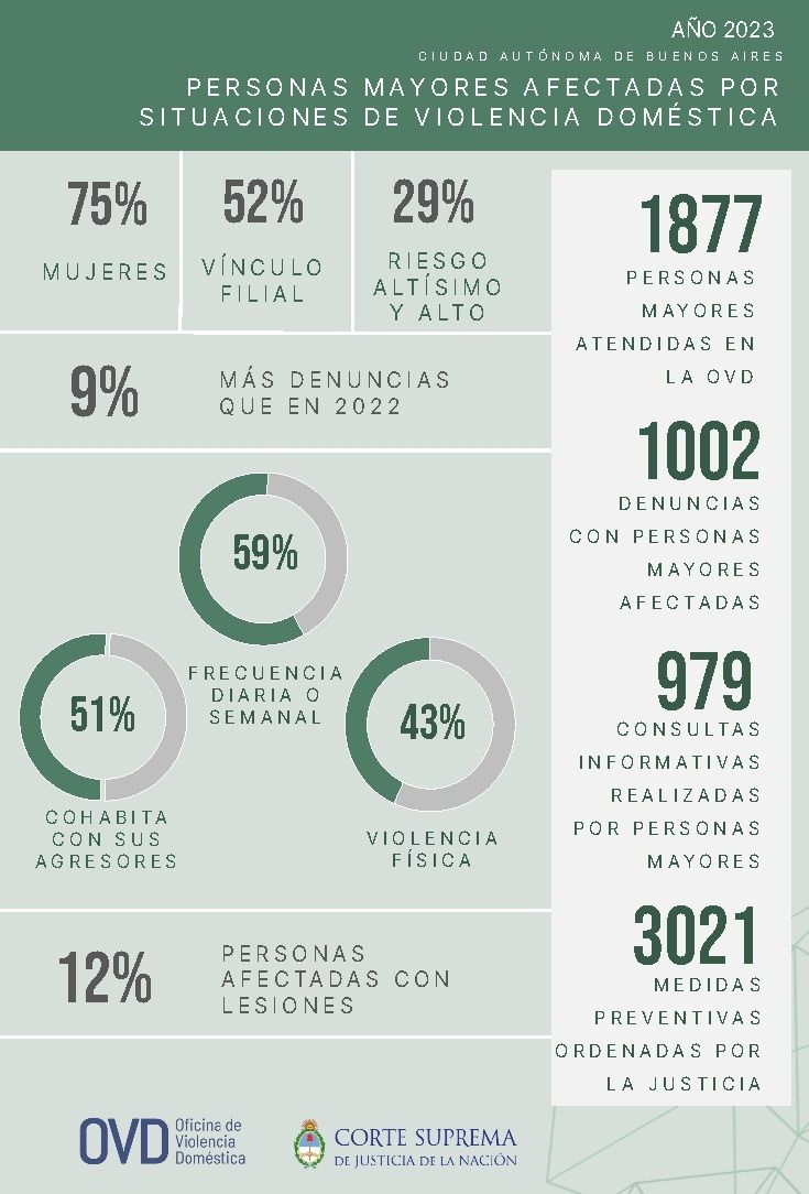 La lucha de las organizaciones contra la violencia de género quizás desconozcan la pesadilla que vive a diario un grupo de etario con menos voz y visibilidad mediática, como lo es el de los adultos mayores. Durante 2023, los equipos interdisciplinarios de la Oficina de Violencia Doméstica (OVD) de la Corte Suprema de Justicia de la Nación recibieron 1002 presentaciones en las que hubo personas mayores de 60 años afectadas por hechos de violencia doméstica en la Ciudad Autónoma de Buenos Aires. Eso representa un aumento porcentual del 9% respecto del año anterior (921) y del 55% respecto al 2020 (645).