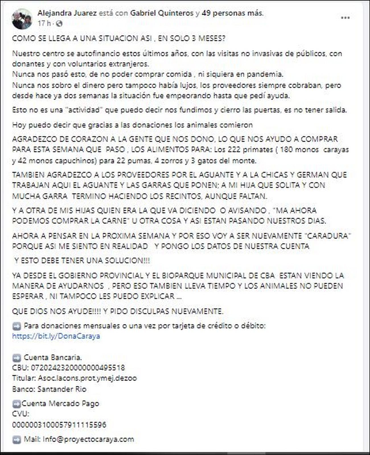 A la espera de una pronta solución a la crítica situación financiera del proyecto que tiene más de 25 años funcionando en la provincia de Córdoba, Juárez señaló: "Ya desde el Gobierno provincial y el bioparque municipal de Córdoba, están viendo la manera de ayudarnos Pero eso también lleva tiempo y los animales no pueden esperar. A ellos no les puedo explicar (que no hay comida). ¡Que dios nos ayude!", cerró su posteo.