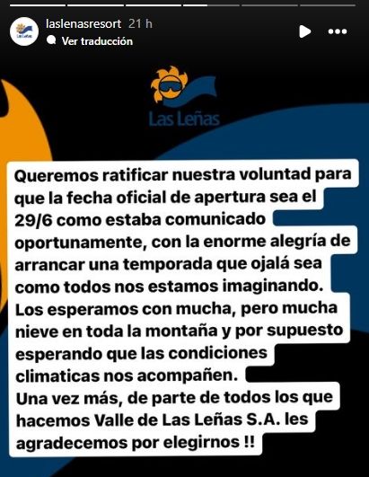 En la cuenta oficial de Las Leñas comunicaron que la intención que tienen desde la organización y la administración del complejo es abrir el 29 de junio como estaba estipulado. "Es nuestra voluntad", destacaron en un comunicado en Instagram.