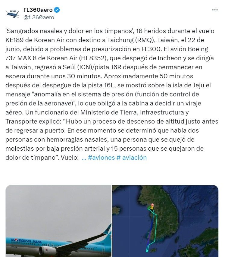 "Sangrados nasales y dolor en los tímpanos", estos son algunos de los percances que tuvieron los pasajeros. El Ministerio de Transporte de Corea del Sur Además señaló que 19 de las 133 personas que se encontraban a bordo fueron trasladadas a hospitales por fuerte dolor de oído y hemorragias nasales.