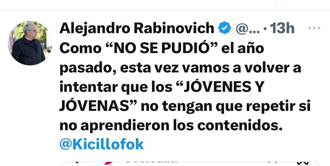 En tanto, Alejandro Rabinovich, jefe de la bancada amarilla en la Cámara Alta provincial, manteniendo su estilo irónico chicaneo por redes sociales al gobernador bonaerense. En su cuenta de “X” escribió, arrobando a Axel Kicillof : “Como ‘NO SE PUDIÓ’ el año pasado, esta vez vamos a volver a intentar que los ‘JÓVENES Y JÓVENAS’ no tengan que repetir si no aprendieron los contenidos“