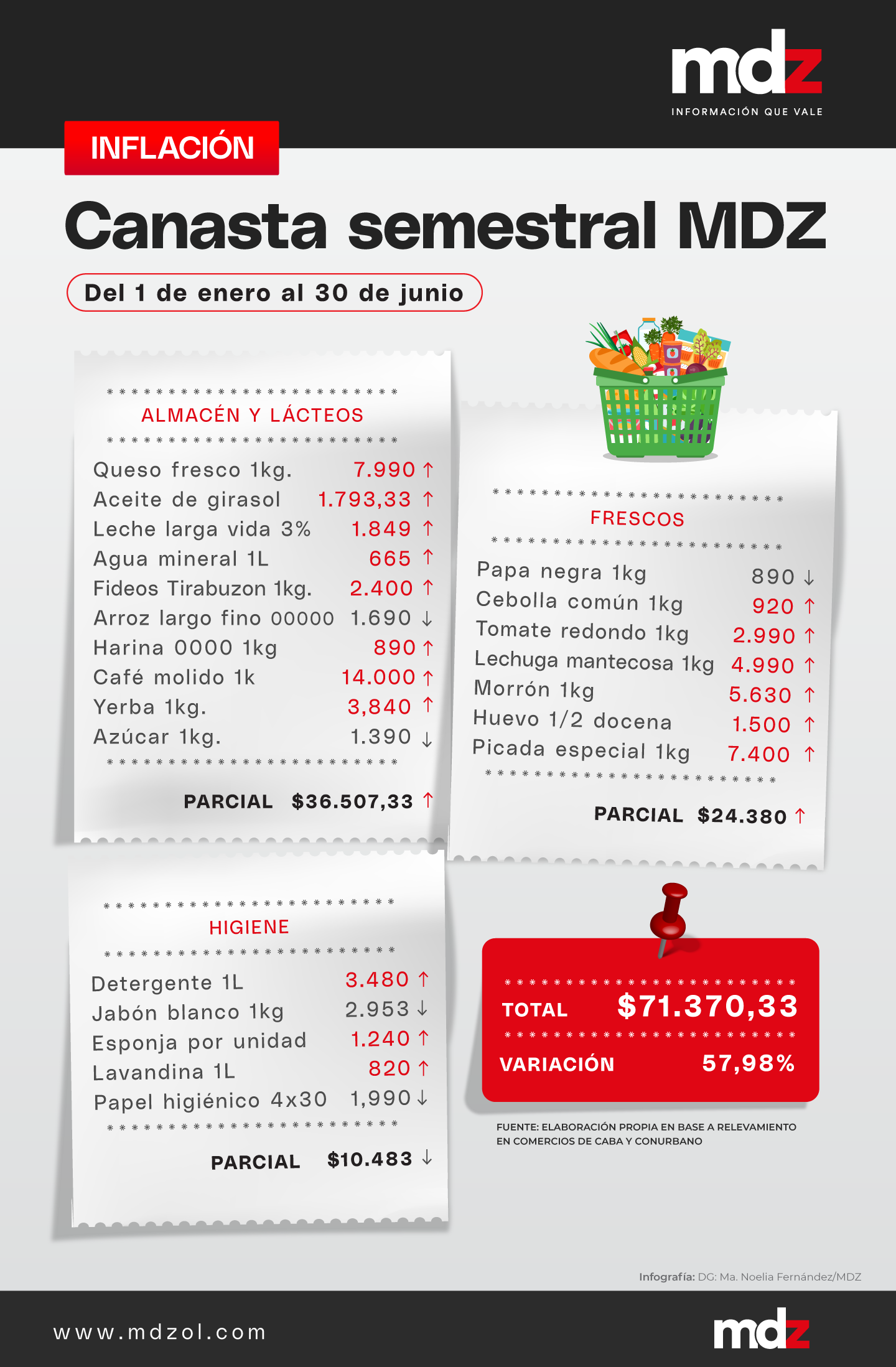 Los primeros seis meses de 2024 tuvieron el foco, principalmente, en los aumentos constantes en todo tipo de sectores, lo que llevó a una fuerte caída del salario y del consumo, lo que en parte colaboró con la desaceleración de la inflación. En la canasta semestral de MDZ, que incluye productos básicos que pueden conseguirse en cualquier supermercado, se registró un aumento promedio cercano al 60%.