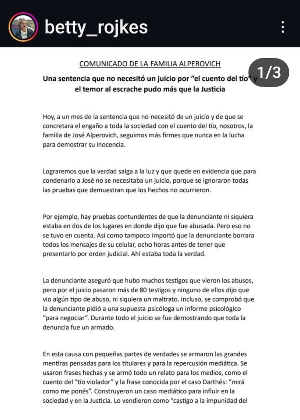 "Hoy, a un mes de la sentencia que no necesitó de un juicio y de que se concretara el engaño a toda la sociedad con el cuento del tío, nosotros, la familia de José Alperovich, seguimos más firmes que nunca en la lucha para demostrar su inocencia", señala en su inicio el texto de comunicado.